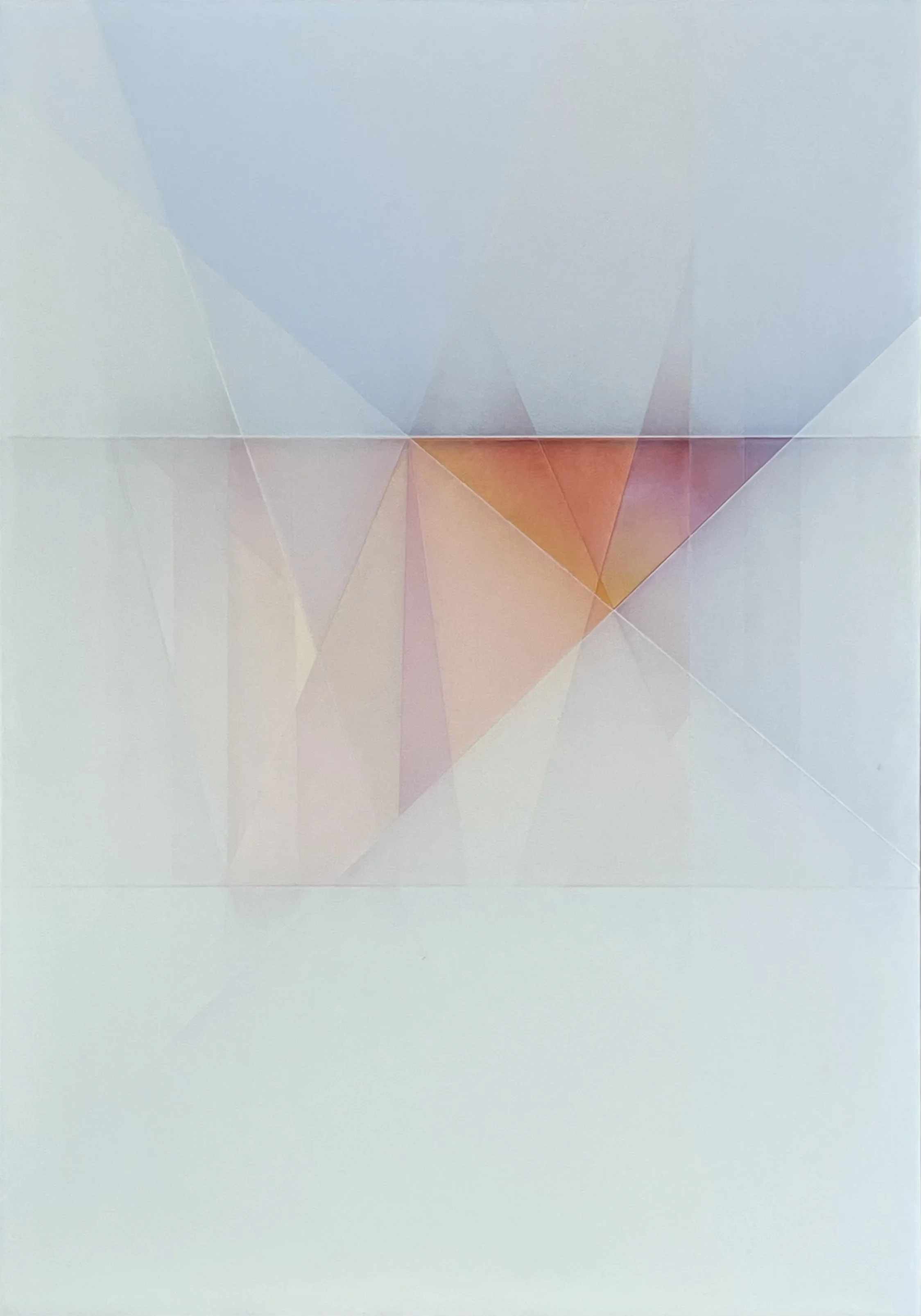 Some common quick impressions of Dassoulas’s work are wrong, the gallerists report. The pileup of many translucent strata yields an effect that resembles encaustic, and some geometric forms appear to be folded or outlined by incisions. But the painter uses only pencil, tape, and glazes of acrylic paint to create his luminous canvases.